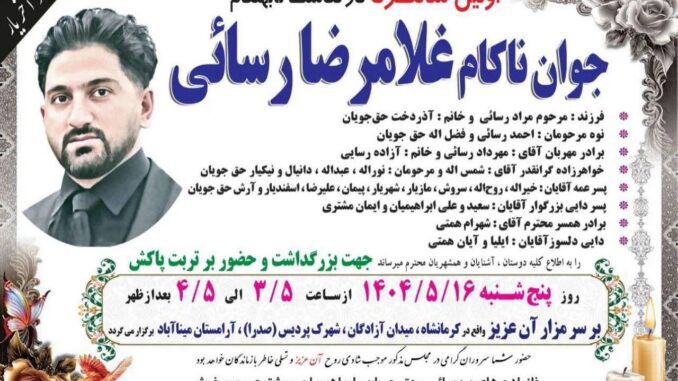 🔵 اولین سالگرد #رضا_رسائی، زندانی سیاسی اعدامشده August 7, 2025 مراسم بزرگداشت او روز ۱۶ مرداد ۱۴۰۴، در کرمانشاه برگزار میشود. رضا رسایی، زندانی سیاسی، در بامداد صبح ۱۶ مرداد ۱۴۰۳ اعدام شد، بدون اینکه حتی به خانواده و وکلای او خبری بدهند .