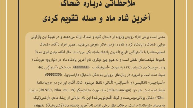 مدتی است برخی افراد روایتی وارونه از داستان کاوه و ضحاک ارائه میدهند و در نتیجۀ این واژگونی روایی، ضحاک را پادشاه کرد و کاوه را فردی خائن معرفی مینمایند. همین افراد ناآگاه، «ضحاک اسطورهها» را با «آستواگسِ تاریخ (آخرین پادشاه ماد)» یکی میدانند! حال آنکه، چنین امری صرفاً نتیجۀ شباهتهای لفظی است و نه هیچ چیز دیگری. نام آخرین پادشاه ماد در «تواریخ» هرودُت (I, 46) به شکل «آستواگِس» (Άστυάγης) و در «پرسیکا»ی کتسیاس (19) به صورت «آستوئیگاس» (Άστυϊγάς) ضبط شده است و امروزه در زبانهای اروپایی به شکل «آستیاژ» (فرانسوی)، «اَستیاجیس» (انگلیسی) و «آستیاگِس» (آلمانی) تلفظ میشود. شکل اَکّدی این نام در «رویدادنامۀ نبونید» (RINB 2, Nbn. 28, i 29) به صورت «ایشتومِگو» (mIš-tu-me-gu) ضبط شده است. هر دو شکل یونانینویسشده و گونۀ اَکَّدینویسشدۀ این نام، بازتابی از ریشۀ مادی «اَرشتیوَئیگَ» (*Ṛšti-vaiga)، به معنای «نیزهانداز»، است. برخلاف نظر برخی افراد، نام آخرین پادشاه ماد (اَرشتیوَئیگَ) هیچ ارتباط واژگانی با نام اوستایی «اژدهاک یا اَژیدَهاکَ»، به معنای «سوزانندۀ مار/اژدها» (؟)، ندارد و فقط و فقط در تلفظی نادرست و در هنگام برگردان به الفبای لاتین و در شکل «آستیاگ»، اندک شباهت صوتی به «اژدهاک» مییابد. نام «ضحّاک» نیز معربشدۀ «اَژدهاک» اوستایی و «اَزدهاگ» فارسی میانه است.