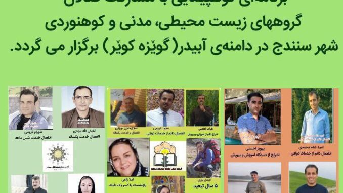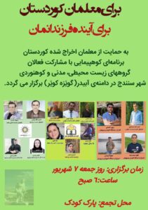 جامعه مدنی و مردم کوردستان، همچنان کە آگاهید هیات تخلفات اداری وزارت آموزش و پرورش ایران در روندی ناعادلانە و با پروندە سازیهای مختلف مجازات سنگینی را علیه معلمان کردستان اعمال نمودە است، کمیتە مردمی حمایت از معلمان اخراجی کوردستان، برای اعلام حمایت عملی خود بە کمک والدین دانش آموزان، جامعەمدنی و فرهنگیان سنندج و گروههای زیست محیطی و کوهنوردی برنامە کوهپیمایی برگزار می‌کند.