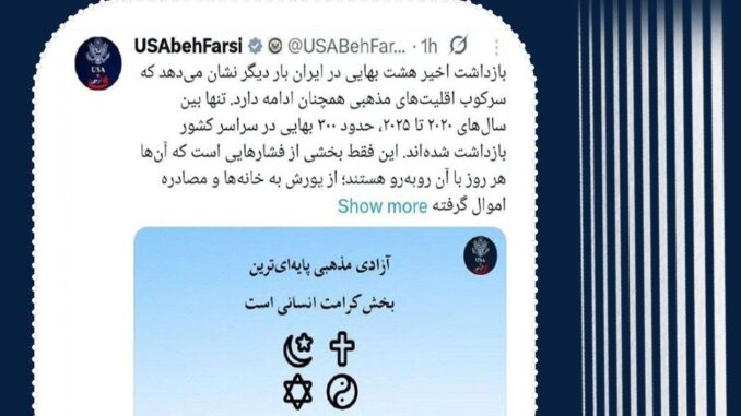 وزارت خارجه ایالات متحده با انتشار پیامی رسمی بە زبان فارسی، جمهوری اسلامی ایران را به اجرای یک سیاست «سیستماتیک، هدفمند و همهجانبه» علیه اقلیتهای مذهبی متهم کرد. در این بیانیه که در واکنش به بازداشت اخیر هشت شهروند بهایی منتشر شد، آمده است که تنها بین سالهای ۲۰۲۰ تا ۲۰۲۵ بیش از ۳۰۰ بهایی در شهرهای مختلف ایران بازداشت شدهاند.